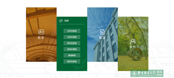新版門戶網站突出新聞展示與功能檢索相融合的整體思路,以我校視覺形象識別系統的“北林綠”為主基調。網站分為題圖展示、新聞速覽、黨建專題、教學科研、媒體矩陣、基礎數據等6大模塊,各個模塊以我校視覺形象系統中的“山”“水”“木”“人”元素相串聯,構建出生生不息、欣欣向榮的視覺效果。