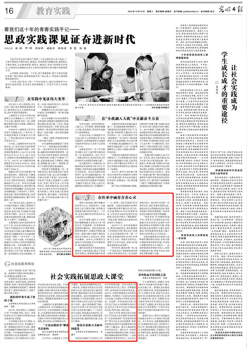 喜慶黨的二十大,傳承奮進新征程。在我校迎來建校70周年華誕之際,《光明日報》以《思政實踐課見證奮進新時代》和《社會實踐拓展思政大課堂》為題報道我校主動適應國家生態(tài)文明建設需求,開展綠色長征,助力美麗中國建設,在社會實踐中深入學習貫徹習近平生態(tài)文明思想,拓展思政大課堂的做法。