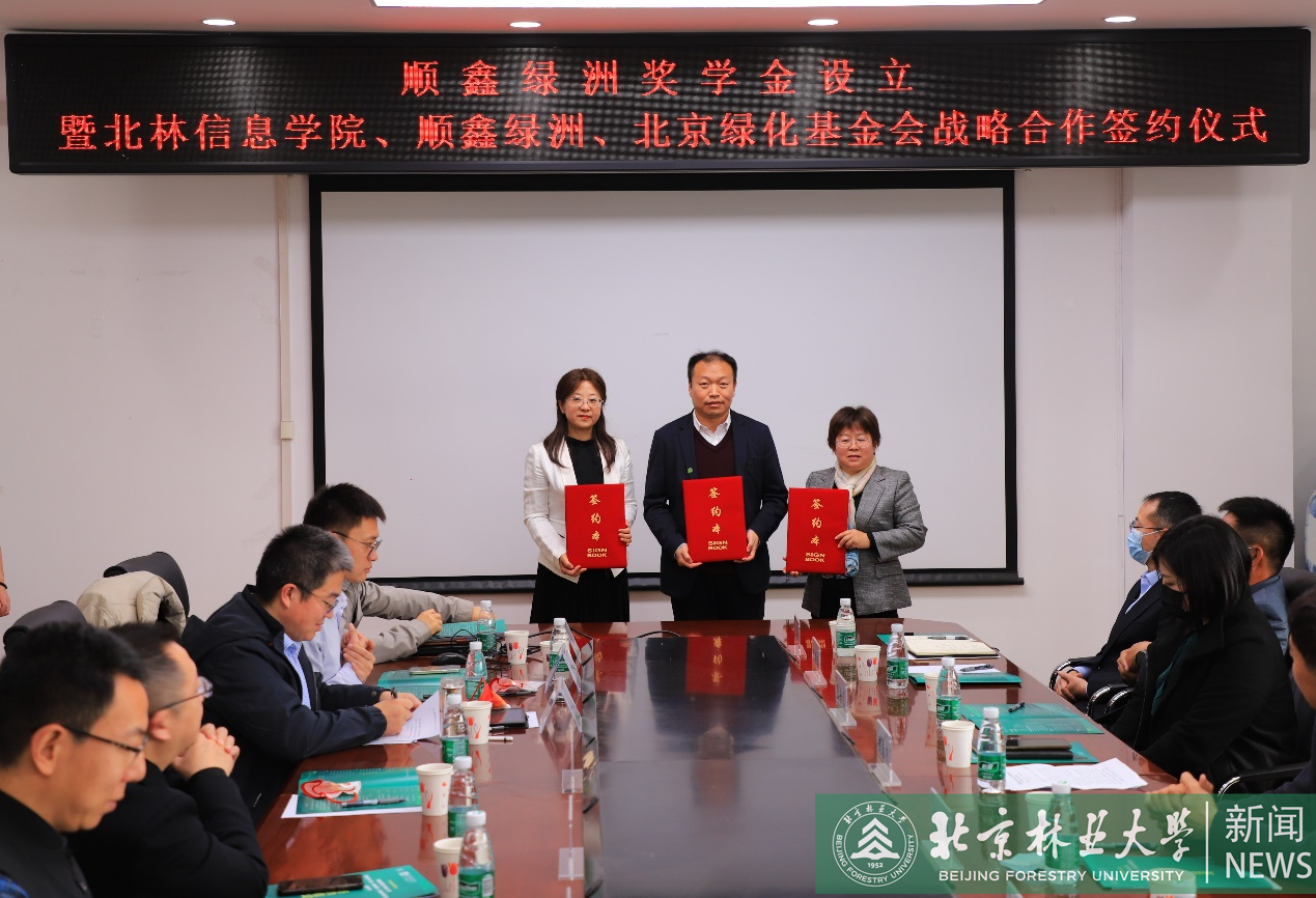 儀式上,北京綠化基金會、北京順鑫綠洲錦繡園林工程有限公司、北京林業大學教育基金會三方簽署獎學金捐贈協議;北京綠化基金會、順鑫綠洲錦繡園林工程有限公司、北京林業大學信息學院三方共同簽署《“北林信息-順鑫綠洲-北京綠化基金會”戰略合作協議》。