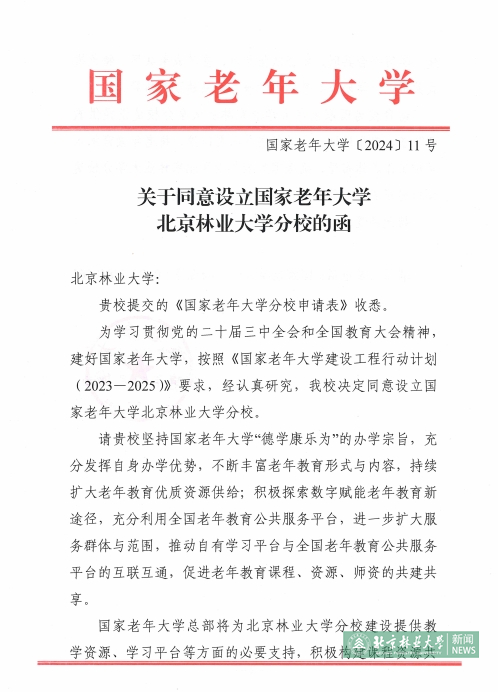 日前,國家老年大學下發《關于同意設立國家老年大學北京林業大學分校的函》,正式批復成立國家老年大學北京林業大學分校,具體承擔協調統籌本區域老年大學建設與發展、推動老年教育辦學服務向城鄉社區延伸等相關職責,標志著我校在立足生態文明建設領域,構建終身學習教育體系上邁出重要一步。