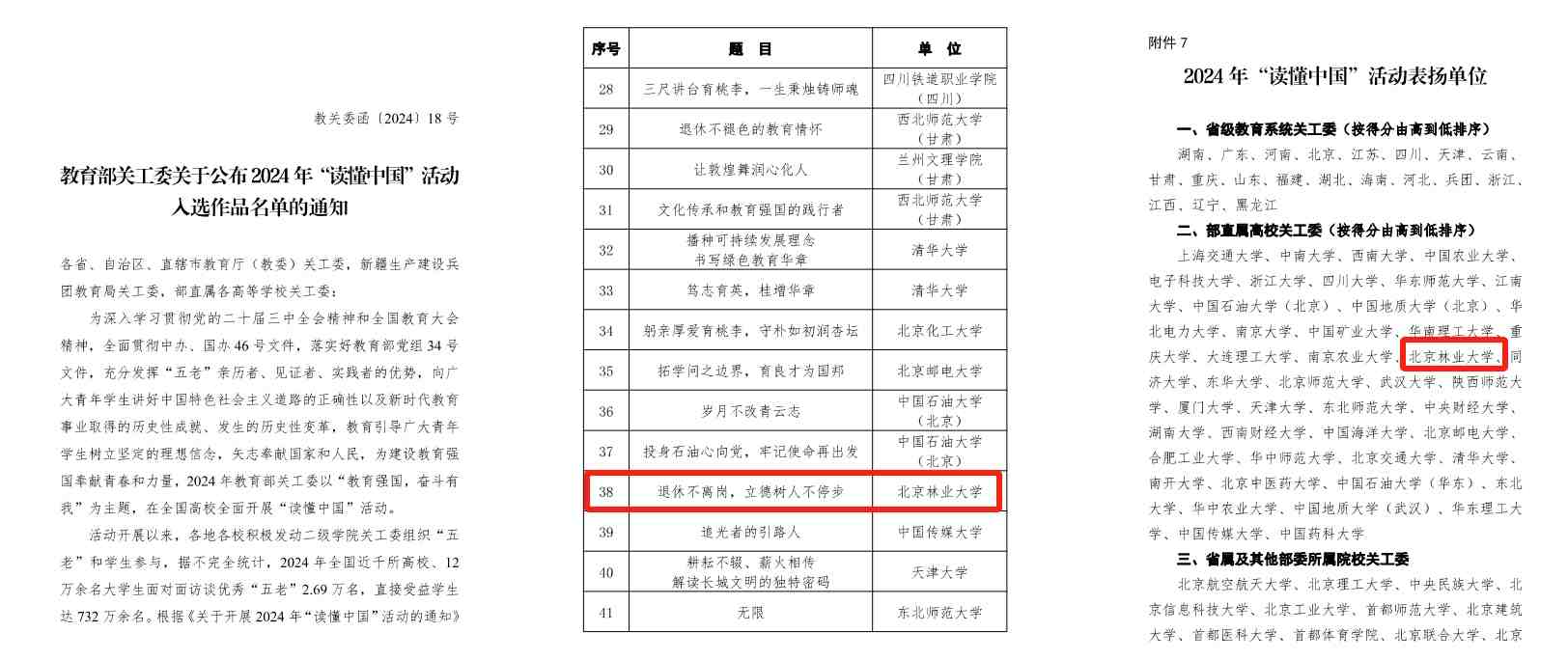 近日,教育部關工委公布2024年“讀懂中國”活動獲獎作品名單。我校信息學院(人工智能學院)報送的《退休不離崗,立德樹人不停步》(訪王九麗教授)微視頻作品入選2024年“讀懂中國”活動優秀微視頻。北京林業大學榮獲2024年“讀懂中國”活動表揚單位。