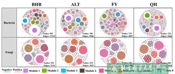 圖4土壤細菌和真菌群落的網絡分析結果。圖中節點代表所有樣本中豐度超過 0.02 %且通過相關性檢驗(R > 0.6,P < 0.05)的擴增子序列變異(Amplicon Sequence Variants, ASVs)。不同顏色表示由不同 ASV s組成的模塊,彩色節點表示存在模塊結構,灰色節點表示不存在模塊結構。