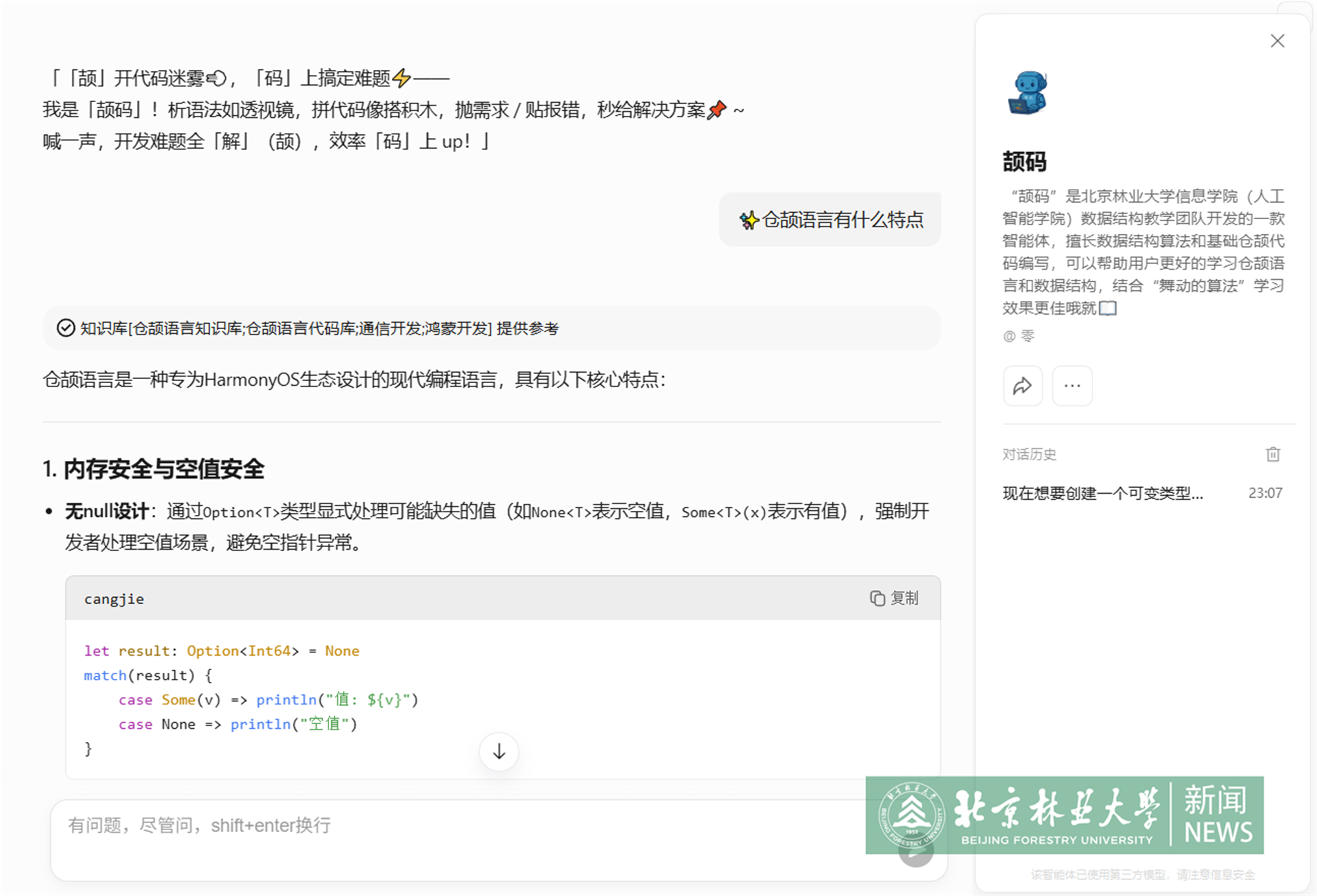 尤為突出的是,系統內置了“算法小精靈”與“頡碼”兩大智能學習助手。其中,“算法小精靈”基于團隊自建的專業知識庫,利用檢索增強生成(RAG)技術,可秒級響應數據結構算法的深度答疑需求;“頡碼”則專注于倉頡語言代碼的輔助編寫與編程難題解答,為學習者提供了全天候、個性化的智能教學支持。