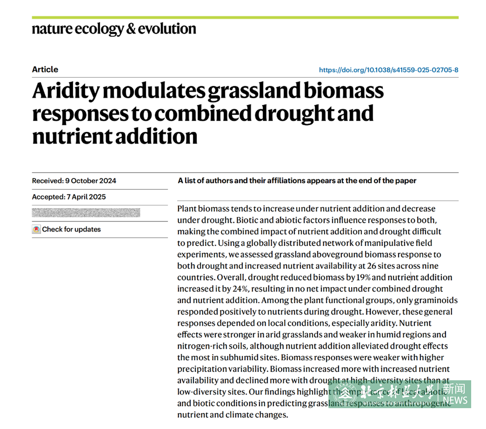 5月19日,草業與草原學院庾強教授以通訊作者身份,聯合阿根廷布宜諾斯艾利斯大學、荷蘭烏德勒支大學等10個國家42家單位的科研人員在《Nature Ecology & Evolution》上發表了最新研究成果“Aridity modulates grassland biomass responses to combined drought and nutrient addition”,探討了草原生態系統生產力對干旱與養分添加及其交互作用的響應及其機制。