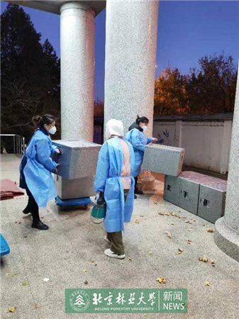 在聽(tīng)到后勤人手不足的消息后,北林附屬幼兒園的孫彩風(fēng)與其他6位老師第一時(shí)間主動(dòng)請(qǐng)求支援一線保障工作。她們負(fù)責(zé)監(jiān)督東一門物流緩沖區(qū)的消殺工作,從早上7點(diǎn)到晚上7點(diǎn),輪班值守,一刻也不松懈。郭家珠是其中的一名黨員,從疫情開(kāi)始就堅(jiān)守在學(xué)校,已經(jīng)許多天沒(méi)有見(jiàn)過(guò)家里的兩個(gè)孩子了。