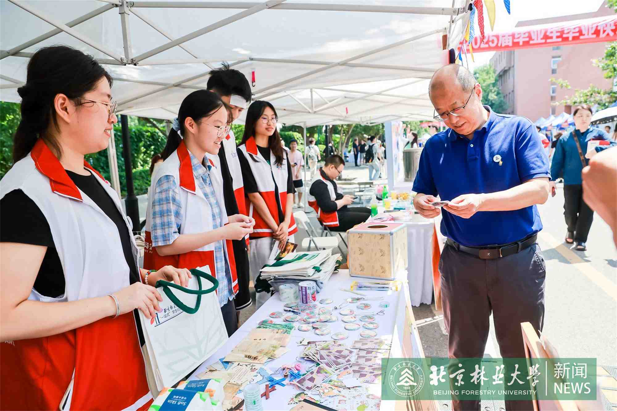 在市集現場,校領導與畢業生親切交流,詢問畢業生們的學習生活情況,傾聽他們對學校發展的建議。校領導鼓勵畢業生們,在新的起點繼續牢記林人初心,永葆林人情懷,在服務生態文明建設的新征程中展現北林學子的風采。在互動環節,校領導在北林融媒的“林印芳華”展位為畢業生加蓋祝福語印章并簽名留念,同時向參加活動的同學們送上精美文創禮物及我校綜合保障部餐飲中心的特色產品。