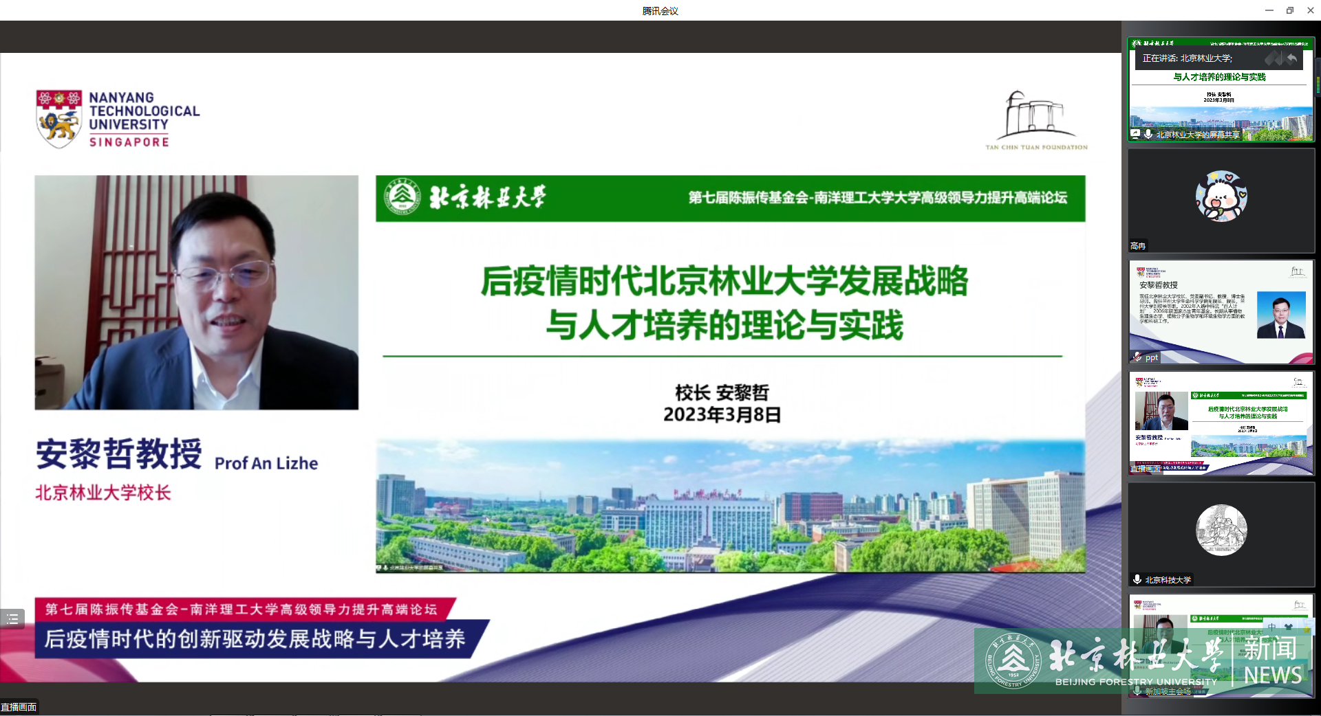 3月8日,第七屆陳振傳基金會-南洋理工大學高級領導力提升高端論壇在新加坡舉辦.校長安黎哲在線作題為“后疫情時代北京林業大學發展戰略與人才培養的理論與實踐”的主旨報告。